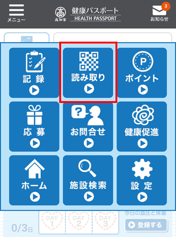 1.健康パスポートアプリ画面左上の「メニュー」をタップします。
