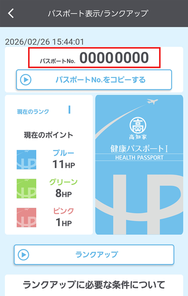 1.「パスポートを表示/ランクアップ」ボタンをタップするとランクアップ画面へ移動します。
